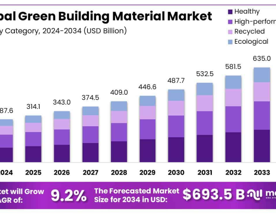The global green building material market for green building materials is on a strong upward trajectory. In 2024, it was valued at USD 287.6 billion, and it's projected to reach USD 693.5 billion by 2034, growing at a robust compound annual growth rate (CAGR) of 9.2%. These materials cover a wide range—from green cement and low-VOC paints to recycled metals, plastics, composites, and natural materials like wood and clay. The aim is clear: reduce environmental impact, improve energy efficiency, and help tackle the roughly 40% of global CO₂ emissions that come from buildings.