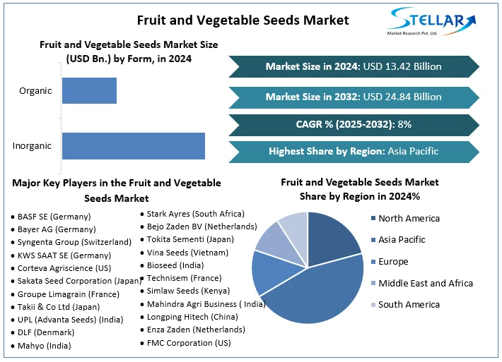 Fruit and Vegetable Seeds Market Industry size was valued at US$ 13.42 Bn. in 2024 and the total revenue is expected to grow at a CAGR of 8% through 2025 to 2032, reaching nearly US$ 24.84 Bn.