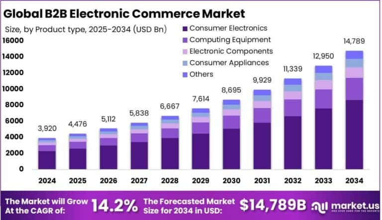 The Global B2B Electronic Commerce Market size is expected to be worth around USD 14,789 Billion By 2034, from USD 3,919.8 Billion in 2024, growing at a CAGR of 14.20% during the forecast period from 2025 to 2034. The Asia-Pacific region was the dominant player in the global B2B Electronic Commerce market in 2024, holding over 42.7% of the market share and generating approximately USD 1,673 billion in revenue.