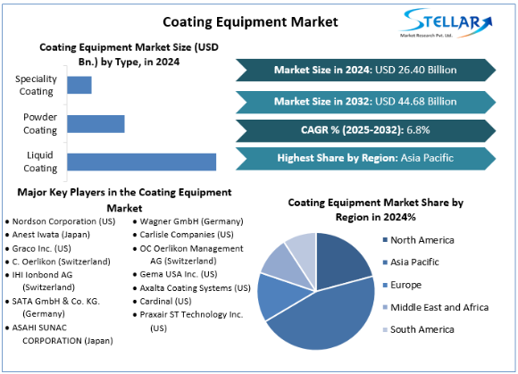 Coating Equipment Market size was valued at US$ 26.40 Bn. in 2024 and the total revenue is expected to grow at 6.8% through 2025 to 2032, reaching nearly US$ 44.68 Bn. by 2032.