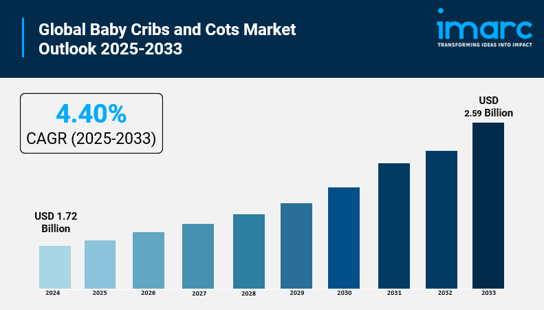 The global Baby Cribs and Cots Market share was valued at USD 1.72 Billion in 2024. The market is projected to reach USD 2.59 Billion by 2033, growing at a CAGR of 4.40% during the forecast period from 2025 to 2033. Key growth drivers include strict safety regulations, high disposable incomes, demand for multifunctional cribs, increasing e-commerce adoption, and rising awareness about infant safe sleep practices.
