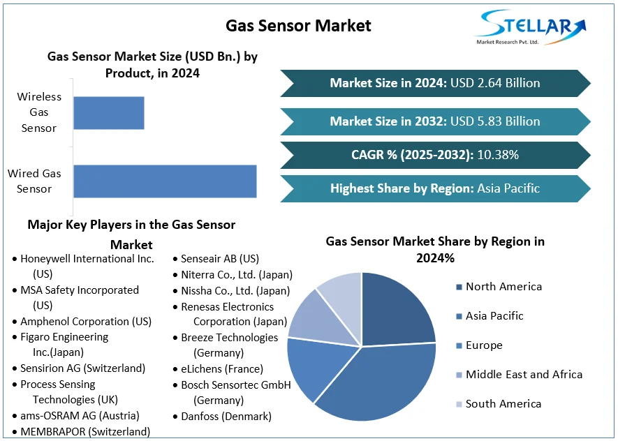 Gas Sensor Market size was valued at USD 2.64 Billion in 2024 and the total size is expected to grow at a CAGR of 10.38 % from 2025 to 2032, reaching nearly USD 5.83 Billion by 2032.