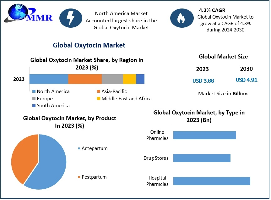 The size of the oxytocin market was estimated at USD 3.66 billion in 2023, and it is anticipated that overall oxytocin revenue will increase at a compound annual growth rate (CAGR) of 4.3% between 2024 and 2030, to reach almost USD 4.91 billion.