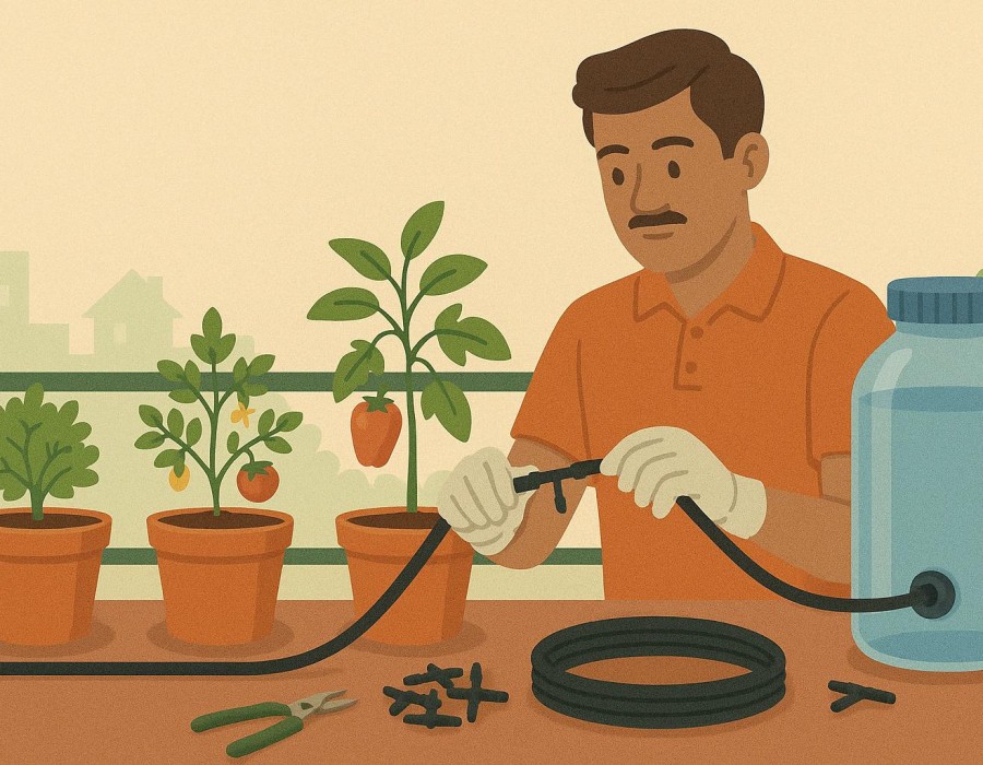 Drip irrigation kits are ideal. They reduce water use and improve yield for vegetables like tomato, chili, and brinjal.