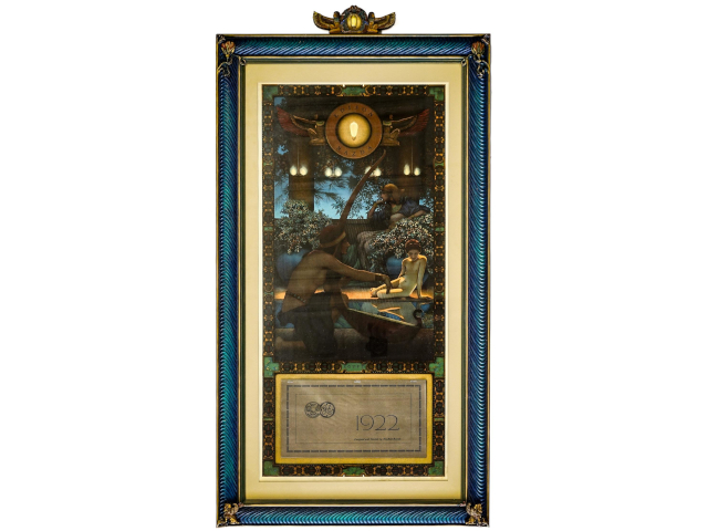Calendars are a huge part of Parrish’s catalog. Lot #8 is an extremely scarce large calendar by Parrish for Edison Mazda Lamps, titled The Lamp Seller of Baghdad. The calendar, from 1923, retains a full pad of calendar pages and measures 26 ¾ inches by 17 inches. It has been professionally framed in a Stephen Hutak custom modern frame. The estimate is $2,000-$3,000.