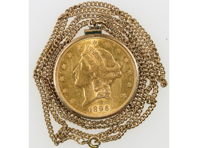 A 26-inch necklace boasting a U.S. Liberty Head 1896-S $20 gold piece in Fine-Extra Fine condition, in bezel, topped out at $3,625. Also, a .999 silver ingot weighing 1 kilogram (or 2.2 pounds / 32.15 troy oz.), probably made in 1980 or 1981 by one of the two or three Reno foundries as an embossed gaming prize from the Riverside Hotel & Casino, achieved $1,375.