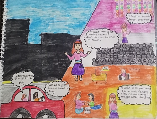 Analysing Paramprit’s drawing, I felt a pang of empathy for that little girl, even though it was a complete imagination but it delved me into the actual situation of today’s young generation. It reminded me of her and all the people out there who, just like her live with social anxiety, the fear to break patterns. But the depiction of the perspective of an introvert served as an emotional call of vigilance for anyone who looks after children’s well-being.
