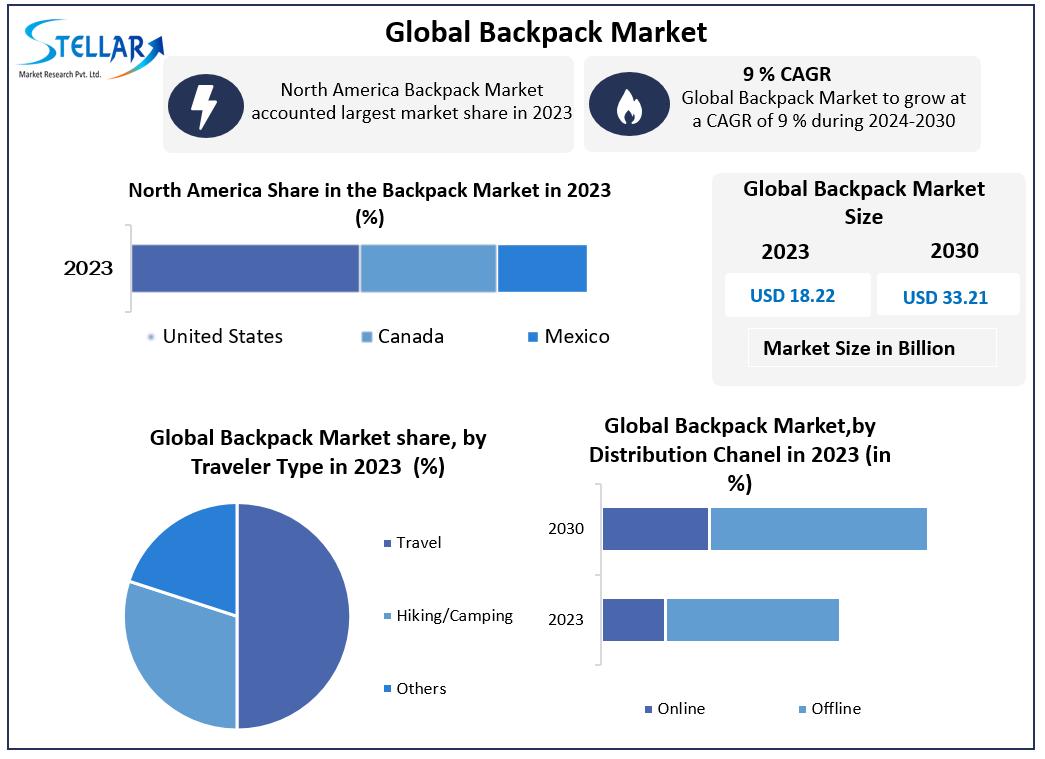 Backpack Market size was valued at USD 18.22 Bn. in 2023 and is expected to reach USD 33.21 Bn. by 2030, at a CAGR of 9%.