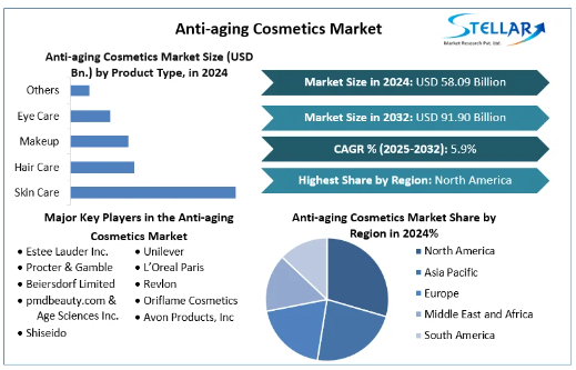 Anti-aging Cosmetics Market was valued at USD 58.09 billion in 2024. Global Anti-aging Cosmetics Market size is estimated to grow at a CAGR of 5.9 % over the forecast period.