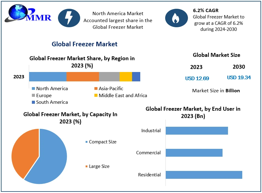 The global Freezer Market Share, valued at USD 12.69 billion in 2023, is projected to grow at a compound annual growth rate (CAGR) of 6.2%, reaching USD 19.34 billion by 2030. This growth is driven by the increasing demand for frozen and convenience food products across various sectors, as well as technological advancements in freezer systems.