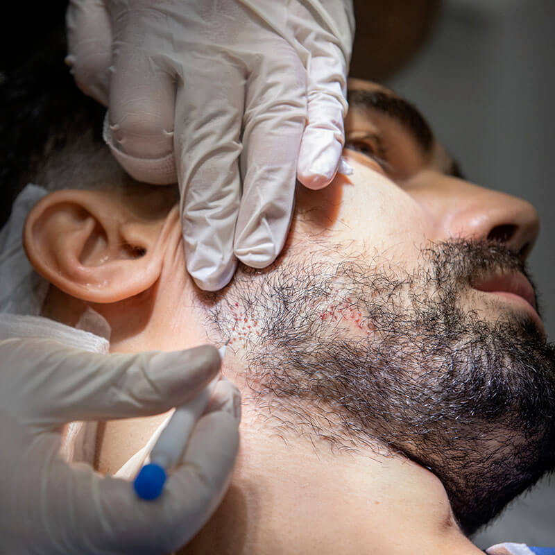 Each graft is placed following the natural direction and angle of the beard, ensuring that the final result looks authentic and well-blended. This process not only fills in sparse areas but also enhances the overall fullness and shape of the beard.