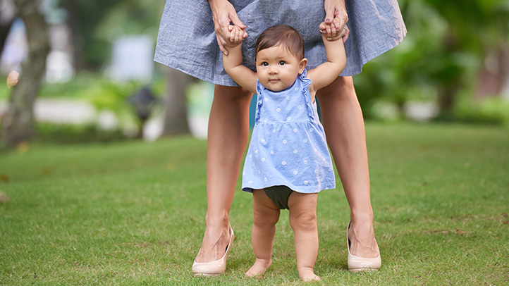 Walking for the first time is one of the many exciting and memorable milestones in your child's development. Your baby has been preparing to walk from an early age. Now all the rolling, sitting up, bottom shuffling, crawling, furniture cruising and standing results in your baby's newest adventure: first steps.