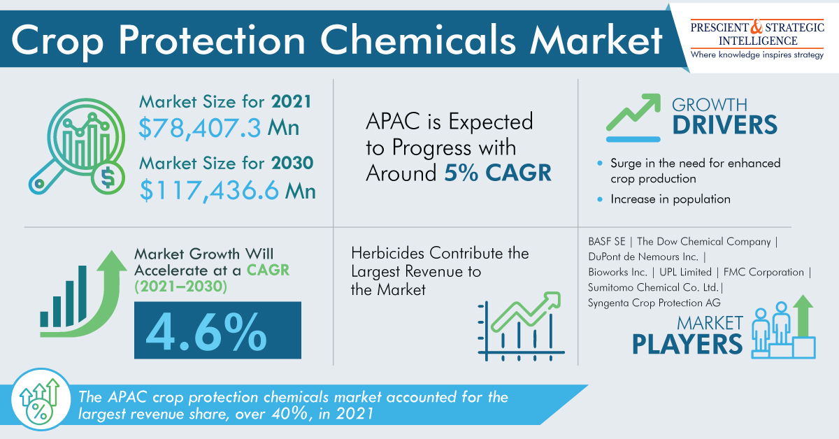 The crop protection chemicals market will propel at a 4.6% compound annual growth rate, to touch USD 117,436.6 million, by 2030.