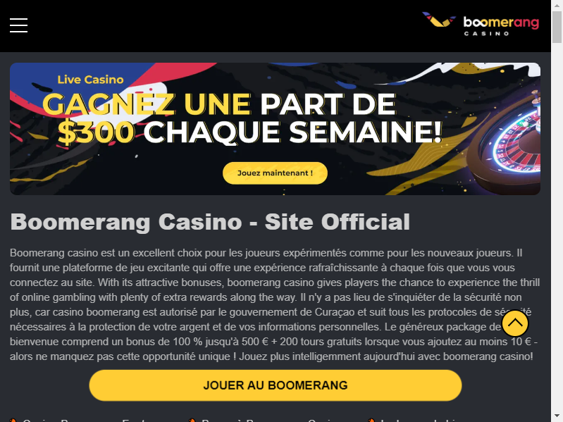 Facile à comprendre et à utiliser. C'est ainsi que l'équipe de boomerang casino fr décrit ses propres applications de jeux mobiles. Le programme de l'opérateur français peut être téléchargé sur la page "App" du site web de Boomerang ; pour l'obtenir, il suffit de placer l'appareil photo de votre appareil sur le code QR qui s'affiche.