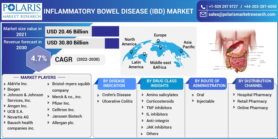 “According to the research report, the global inflammatory bowel disease treatment market was valued at USD 20.46 billion in 2021 and is expected to reach USD 30.80 Billion By 2030, growing at a CAGR of 4.7% during the forecast period.”