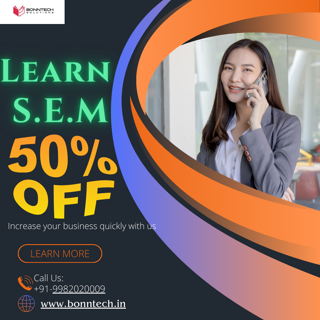 Unlock the full potential of your business by mastering Search Engine Marketing (SEM) with BONNTECH Solutions. Learn how to boost website traffic, maximize conversions, and elevate your brand online. Don’t miss out on our limited-time offer: 50% off our in-depth SEM course. Call +91-9982020009 or visit www.bonntech.in today to reserve your spot!
