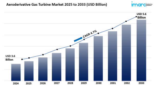 The global aeroderivative gas turbine market size reached USD 3.6 Billion in 2024. Looking forward, IMARC Group expects the market to reach USD 5.6 Billion by 2033, exhibiting a growth rate (CAGR) of 4.7% during 2025-2033.