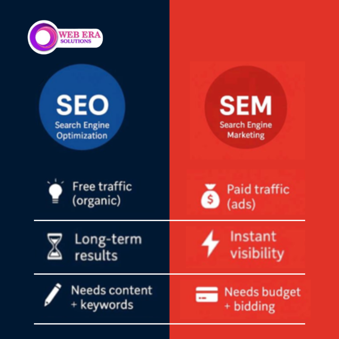 At Web Era Solutions, we’re often asked: Which one should I choose—SEO or SEM? The answer depends on your business goals, budget, and timeline. Let’s break down both options and help you make the best decision for your brand.