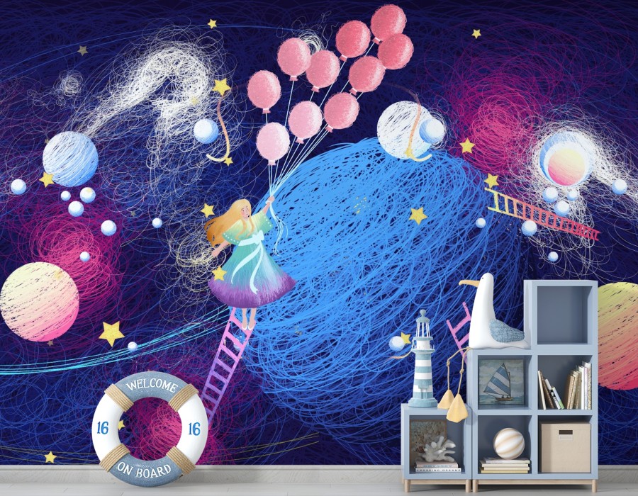 Transform your bedroom into a celestial wonderland with glow-in-the-dark space wallpaper. During the day, it serves as a beautiful mural of the cosmos. But when the lights go out, it comes to life, illuminating your room with a soft, ethereal glow. This type of kids space wallpaper is particularly popular with kids but can also add a whimsical touch to any space.