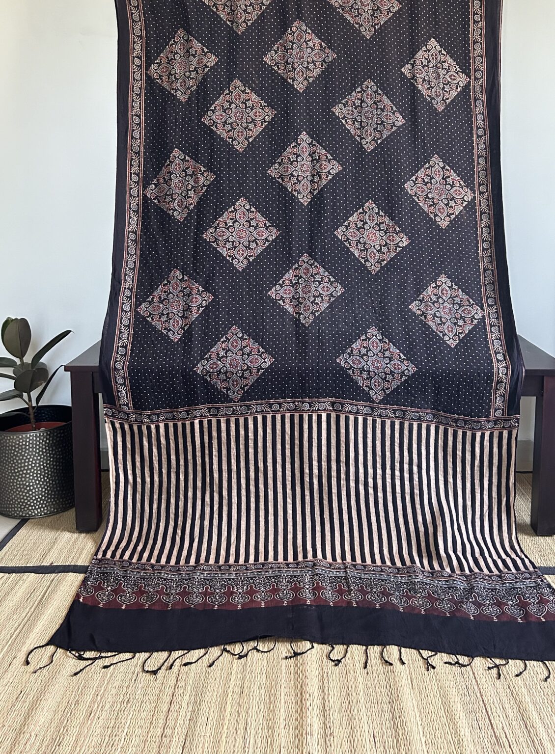 - Eco-friendly and Sustainable: The use of natural dyes and hand-block printing techniques ensures that Ajrakh sarees are sustainable and eco-friendly. They are a great choice for those who are environmentally conscious and prefer sustainable fashion.