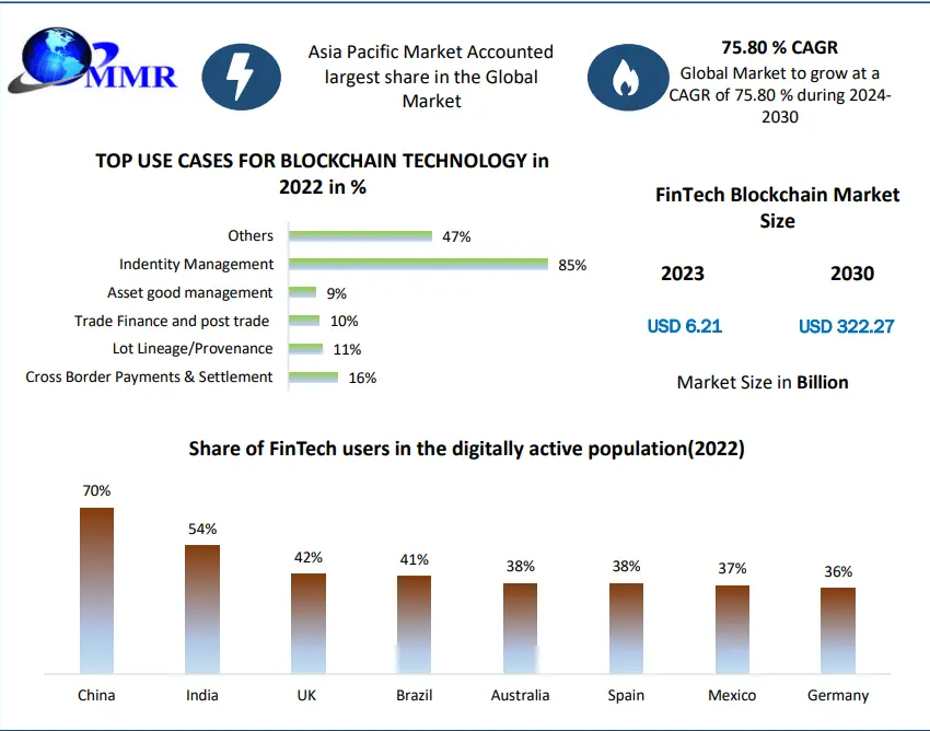 FinTech Blockchain Market was valued at USD 6.21 Bn in 2023 and is expected to reach USD 322.27 Bn by 2030, at a CAGR of 75.80 percent during the forecast period.
