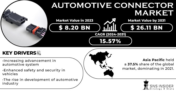October 7, 2024 — The global Automotive Connector Market is experiencing rapid growth, with its market size valued at USD 8.20 billion in 2023. The market is projected to expand significantly, reaching USD 26.11 billion by 2031, at a robust CAGR of 15.57% during the forecast period from 2024 to 2031. The surge in demand for advanced automotive electronics and the increasing electrification of vehicles are major factors driving this impressive growth.