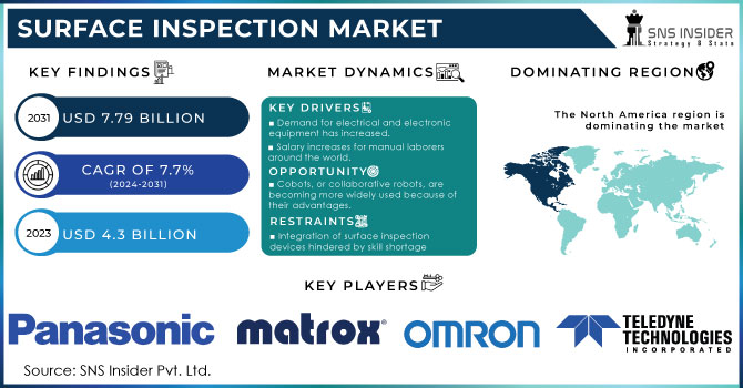 The key players in the surface inspection market are Sony Corporation, Omron Corporation, Panasonic Corporation, Matrox Electronic Systems, Teledyne Technologies Incorporated, Allied Vision Technologies, Basler, Cognex Corporation, ISRA Vision, Keyence Corporation & Other Players.