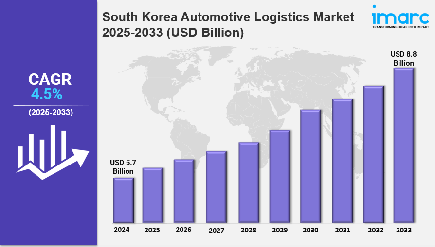 The South Korea Automotive Logistics Market size of USD 5.7 Billion in 2024 and is expected to grow to USD 8.8 Billion by 2033, with a CAGR of 4.5% during 2025-2033. This growth is driven by South Korea's robust economy, advancements in logistics technologies, rising online auto parts sales, government initiatives, and stricter environmental regulations.