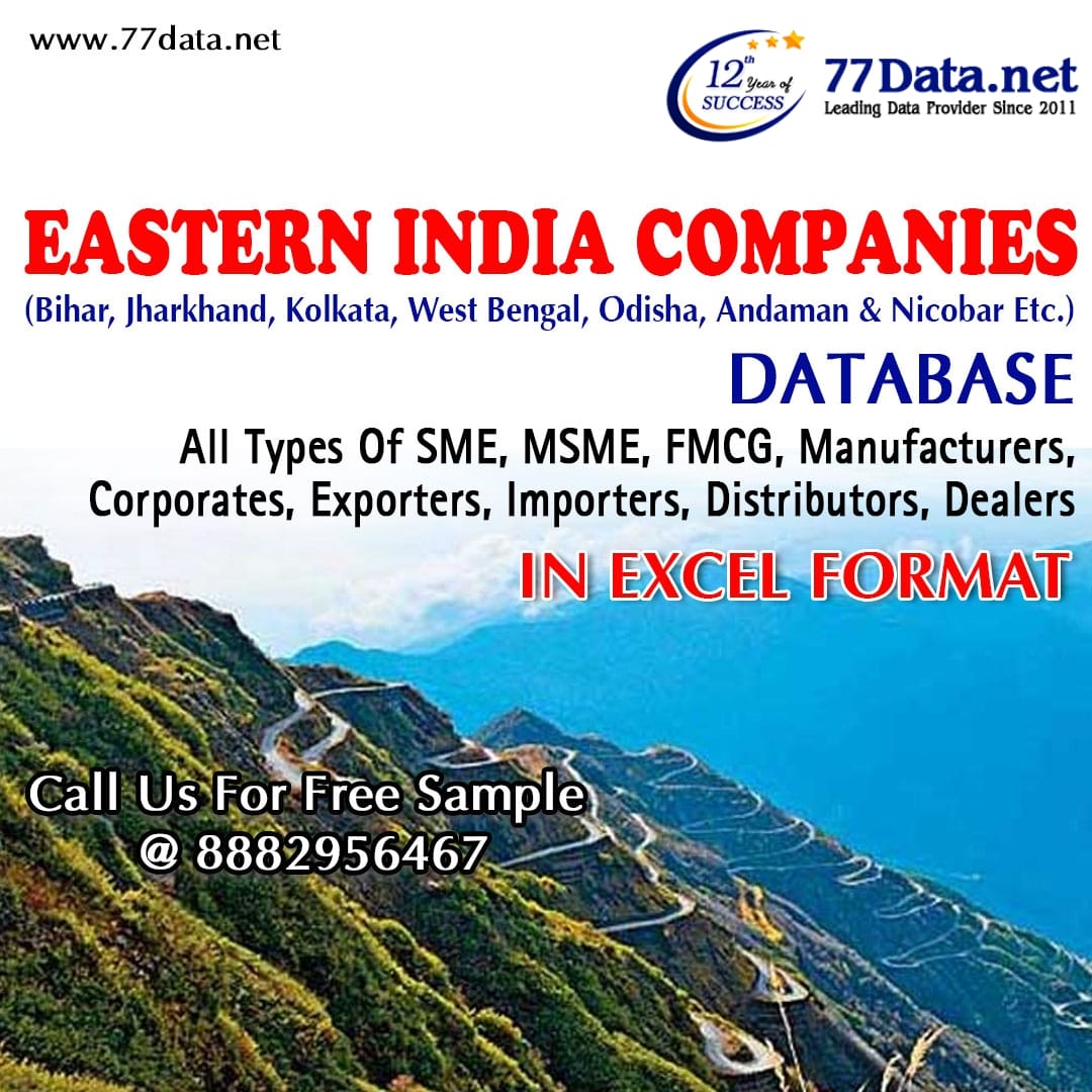 77Data is one of the best Database providers in Eastern India. Get a high-quality, verified, and up-to-date B2B company and Industry database in Excel format, with 70-85% accuracy. Get India's city databases, such as Delhi NCR, Noida, Gurugram, Mumbai, Pune, Bangalore, Kolkata, Chennai, Tamil Nadu, Hyderabad, and many more locations. We provide you with India’s city and state-wise companies and industry databases.