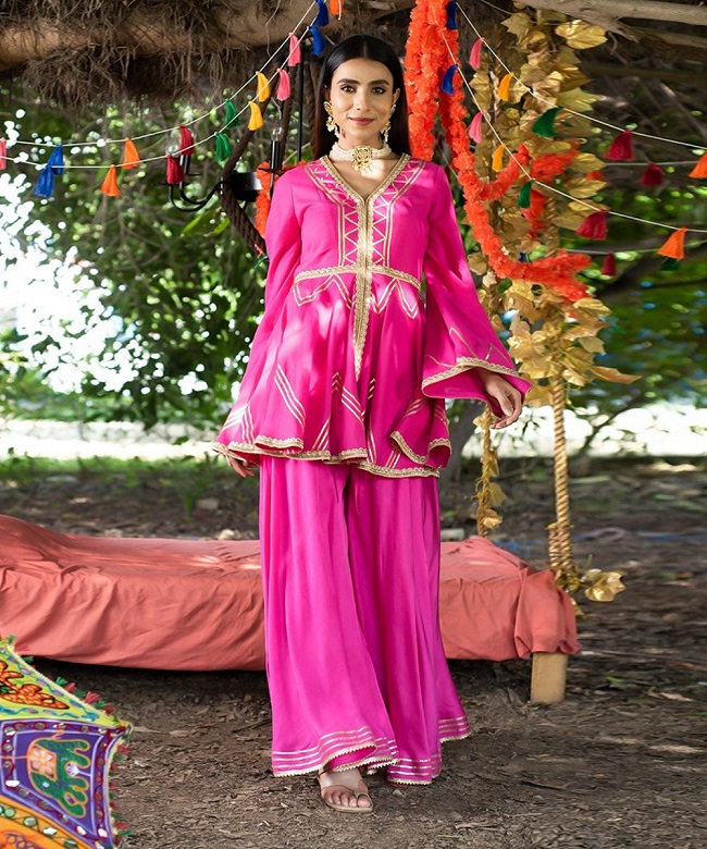 Accessories play a key role in elevating the overall look of a sharara set. Statement jewelry, such as intricately designed earrings or a statement necklace, can add a touch of glamour and personality to your ensemble. Additionally, selecting the right footwear is essential for completing your look. Whether you opt for traditional juttis or contemporary heels, choose footwear that complements the style and color of your sharara set.