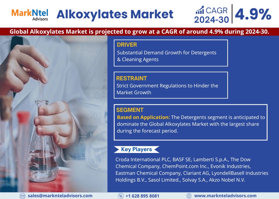 The Global Alkoxylates Market size is projected to grow at a CAGR of 4.9% in the forecast period of 2024-30, cites MarkNtel Advisors in their recent research report. Such significant growth attributes to the growing sustainability consciousness emerging in consumers, demonstrating a greater inclination toward using Alkoxylates owing to their eco-friendly nature.