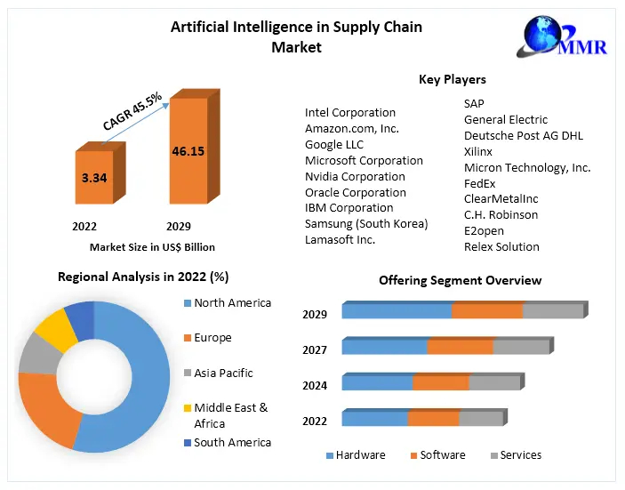 Artificial Intelligence in Supply Chain Market size was valued at US$ 3.34 Bn. in 2022 and the total revenue is expected to grow at 45.5 % through 2023 to 2029, reaching nearly US$ 46.15 Bn.