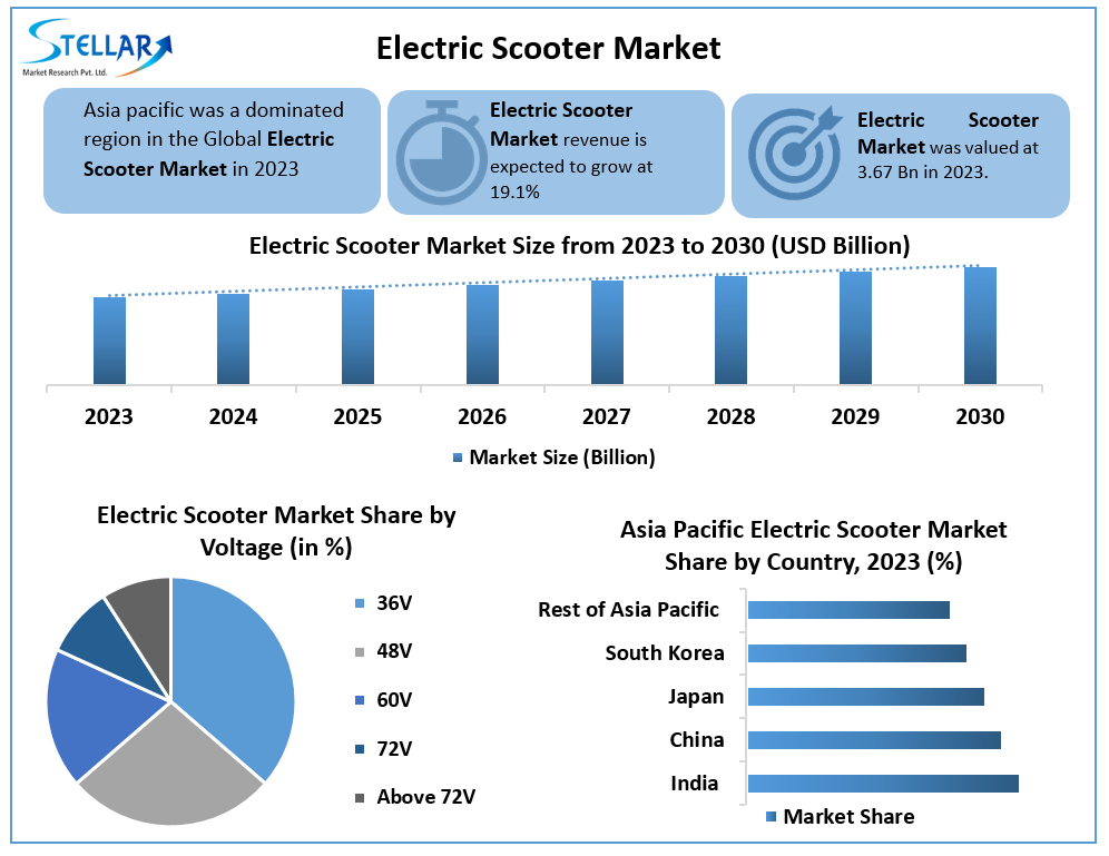 Stellar Market Research, an Electric Scooter business research firm has published a report on the “Electric Scooter Market”. As per the “Electric Scooter report,” the total market for Electric Scooter size was valued at USD 3.67 Bn. in 2023 and is expected to reach USD 12.48 Bn. by 2030, at a CAGR of 19.1%.