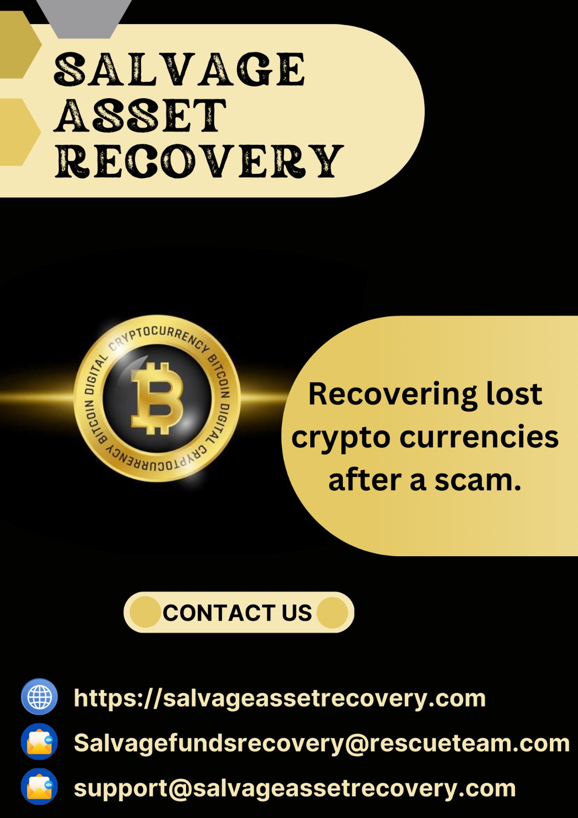 At first, these scammers were incredibly smooth. They made everything appear legitimate, acting as though my money was safe with them. They even went so far as to show me how to withdraw funds, building an illusion of trust. It seemed like a legitimate platform, and they were very convincing. I believed I was dealing with professionals, and for a while, things seemed fine. But as soon as they realized that they wouldn’t be able to extract another penny from me, they stopped responding to my calls and emails. The once friendly customer service turned cold, and all communication ceased. They blocked me on all channels, leaving me stranded and unable to access my funds. These scammers know exactly how to play their victims, making it seem like they’re here to help, only to pull the rug out from under you when they’ve gotten what they wanted. The whole situation felt like a trap, designed to manipulate and steal from people like myself. It’s a classic scam, and I’m sure many others have fallen for it. If my money had been returned to me, I would have taken down this warning, but unfortunately, what I experienced was straight-up theft. They took my funds and left me with nothing but frustration. I felt completely helpless, but just when I thought there was no chance of getting my money back, I stumbled upon Salvage Asset Recovery. At first, I was skeptical, having already been burned by a fake platform, but Salvage Asset Recovery turned out to be the lifeline I desperately needed. They guided me through the entire process of recovering my funds, patiently answering my questions and keeping me informed every step of the way. After a lot of effort and persistence, I was able to successfully withdraw my money back into my bank account. It felt like a miracle, and I could finally breathe again. Salvage Asset Recovery truly went above and beyond, offering professional assistance when I was at my lowest. They were the difference between losing everything and getting my funds back. I want to share my story as a warning to others about the dangers of online scams, especially fake platforms that appear legitimate at first. It’s crucial to be cautious and do thorough research before trusting any online investment opportunity. At the same time, I cannot recommend Salvage Asset Recovery enough. They not only helped me recover my funds but also showed genuine care and expertise in handling such situations. If you ever find yourself in a similar position, don’t lose hope there are people out there who can help you get your money back. Send a DM to Salvage Asset Recovery via below contact details.