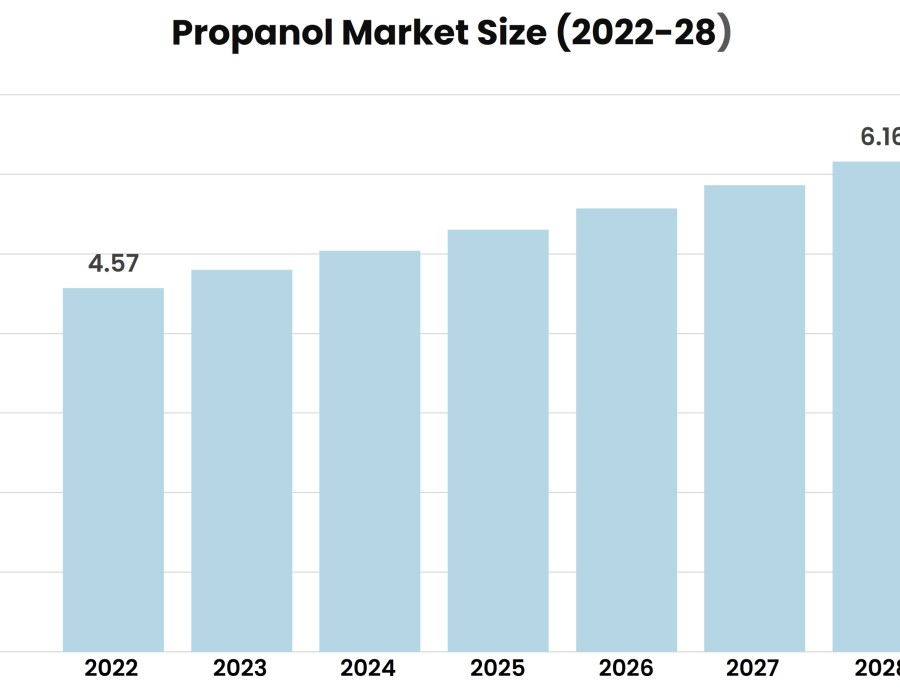 According to Stratview Research, the propanol market was estimated at USD 4.57 billion in 2022 and is likely to grow at a CAGR of 5.11% during 2023-2028 to reach USD 6.16 billion in 2028.