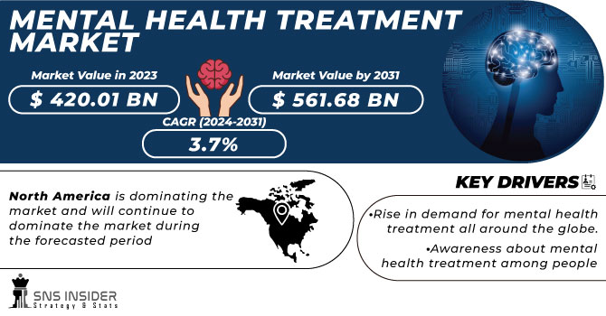 The Mental Health Treatment Market share was valued at USD 420.01 Bn in 2023 and is expected to reach USD 561.68 Bn by 2031, and simultaneously grow at a CAGR of 3.7% over the forecast period of 2024-2031.
