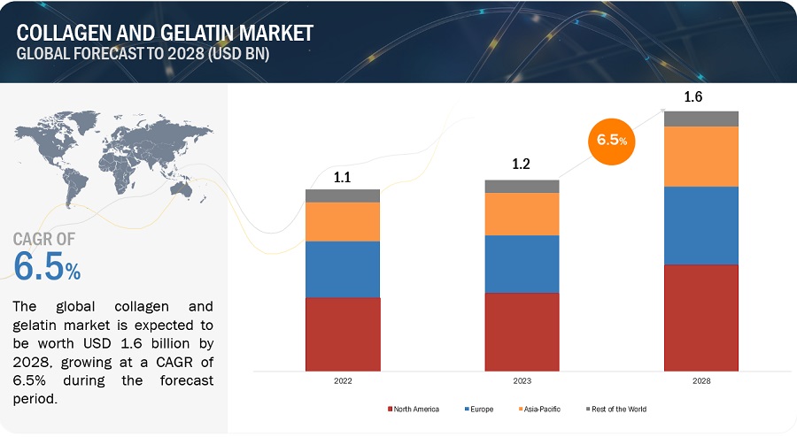 The global Collagen and Gelatin Market in terms of revenue was estimated to be worth $1.2 billion in 2023 and is poised to reach $1.6 billion by 2028, growing at a CAGR of 6.5% from 2023 to 2028. The new research study consists of an industry trend analysis of the market. The new research study consists of industry trends, pricing analysis, patent analysis, conference and webinar materials, key stakeholders, and buying behaviour in the market. The rising incidence of chronic diseases, increasing demand for collagen and gelatin due to increased demand for wound care products, and strong emphasis on the launch of novel products by key market players are driving the market growth.