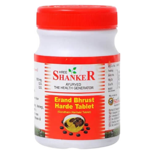 Shree Shanker Erand Bhrust Harde Tablet is an ayurvedic product useful for dealing with chronic constipation, gas, indigestion, acidity and headache. It supports digestive health.