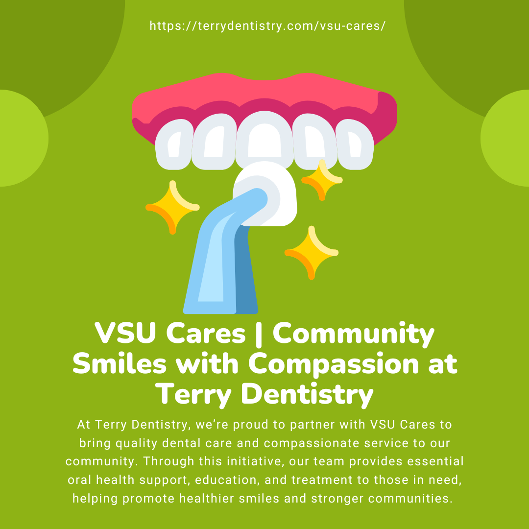 At Terry Dentistry, we’re proud to partner with VSU Cares to bring quality dental care and compassionate service to our community. Through this initiative, our team provides essential oral health support, education, and treatment to those in need, helping promote healthier smiles and stronger communities. We believe everyone deserves access to quality dental care, and VSU Cares allows us to make that vision a reality. Join Terry Dentistry in supporting this meaningful cause as we continue to spread smiles and make a lasting impact through care and compassion.