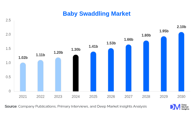 The global baby swaddling market size was valued at USD 1.3 billion in 2024 and is projected to grow from USD 1.41 billion in 2025 to USD 2.1 billion by 2030, exhibiting a CAGR of 8.4% during the forecast period (2025–2030).
