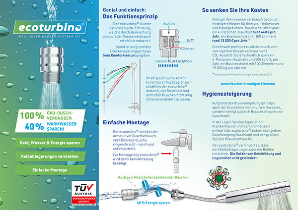 Wenn Sie nach einer einfachen Methode suchen, Ihren Wasserverbrauch zu reduzieren und Ihren ökologischen Fußabdruck zu verringern, sollten Sie in ein wassersparendes Duschset mit dem ecoturbino® investieren. Diese innovativen Duschsets sind darauf ausgelegt, den Wasserverbrauch zu minimieren, ohne die Qualität Ihres Duscherlebnisses zu beeinträchtigen, und stellen somit eine umweltfreundliche Lösung für jedes Badezimmer dar.