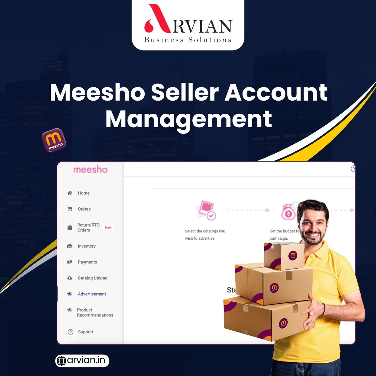Among many service providers, Arvian stands out as a reliable name, offering end-to-end meesho seller account management services. They specialize in helping sellers - from early to established businesses - manage their accounts efficiently and promote their sales on meesho.