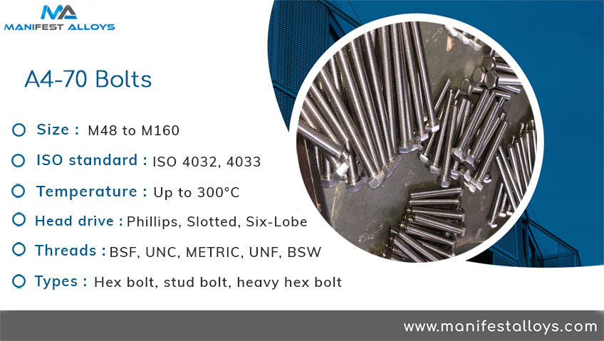 Manifest Alloys, through its Manufacturing, Trading and Export facilities, supplies a range of fastener products that meet the properties required by the specific standard. A4-70 Bolts is one element of our product range. It has excellent forming and welding characteristics. Our divisions are equipped with modem facilities for Development, Quality Audit and Manufacturing of our products. We produce a diverse range of fasteners like Nuts, Bolts, Screws, Socket Products, Machine Screws, Washers etc.