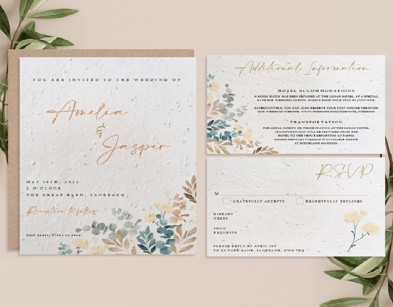 Our plantable wedding invitations are made from recycled paper embedded with wildflower seeds. This means that instead of throwing the invitation away after the wedding, your guests can plant it in soil, water it, and watch as beautiful wildflowers grow in memory of your special day.
