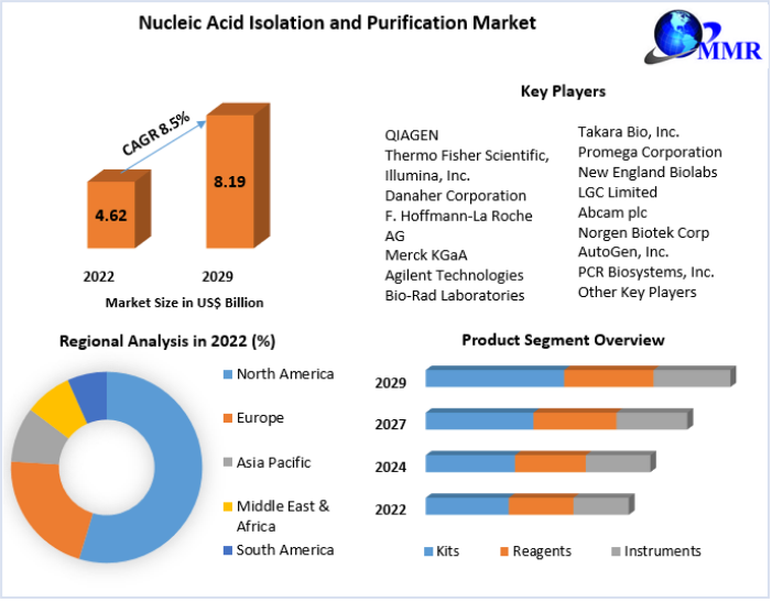 Nucleic Acid Isolation and Purification Market size is expected to grow at a CAGR of 8.5% during the forecast period and the market size is expected to reach nearly USD 8.19 Billion by 2029.