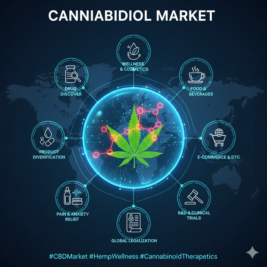 The Cannabidiol Market focuses on the commerce of products containing Cannabidiol (CBD), a non-psychoactive cannabinoid primarily derived from the industrial hemp variety of the Cannabis sativa L. plant. Unlike its psychoactive counterpart, Tetrahydrocannabinol (THC), CBD is marketed for its potential therapeutic properties, including anti-inflammatory, analgesic, and anxiolytic effects, without inducing a “high.” The market spans a wide array of end-uses, from strictly regulated pharmaceuticals to rapidly expanding consumer wellness products, including edibles, oils, tinctures, topicals, and beverages. Its exponential growth in recent years is fundamentally linked to the evolving global regulatory environment, increasing consumer acceptance of plant-based wellness solutions, and a surge in scientific research validating its efficacy for various conditions.
