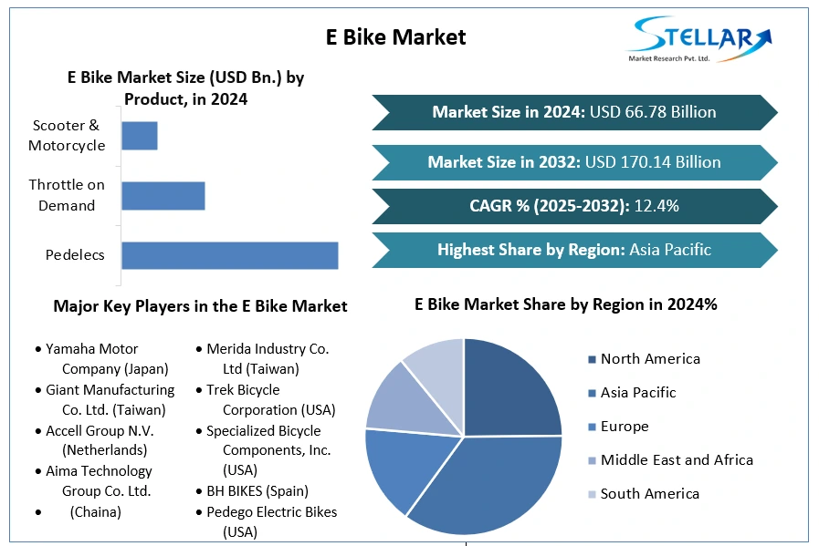 E Bike Market Industry size was valued at US$ 66.78 Billion in 2024 and the total E Bike Market revenue is expected to grow at 12.4% through 2025 to 2032, reaching nearly US$ 170.14 Billion.
