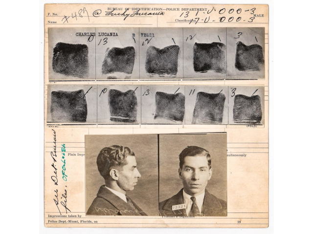 Lot #17 is also a “Lucky” Luciano mug shot / fingerprint card, with image, dated Feb. 2, 1931, after his arrest for felony assault in New York. The photo captures Luciano right before he made the Mafia, a rising lieutenant on the threshold of power (estimate: $15,000-$20,000). Lot #18 is “Luck”y Luciano’s two-page FBI “rap sheet” from 1936, issued at the time of his conviction for compulsory prostitution, one that sentenced him to 30-50 years in prison (estimate: $400-$600).