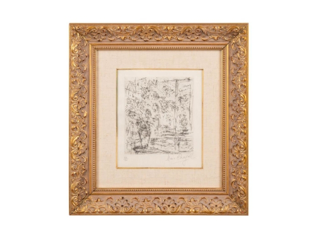 A circa 1986 black and white etching on paper by Marc Chagall (French/Russian, 1887-1985), titled La Fenetre de L’atelier a St. Paul, is expected to finish at $1,200-$2,400. The etching has an image size of 6 ½ inches by 5 ¾ inches and a frame size of 16 inches by 16 inches. It’s pencil signed lower left and editioned “44/50” to the lower left. There’s a gallery label from Collins & Kent in Australia on verso.
