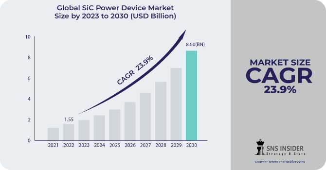 The SiC Power Device Market size was valued at $ 1.55 Bn in 2022 and is expected to grow to $ 8.60 Bn by 2030 and grow at a CAGR Of 23.9% by 2023-2030.